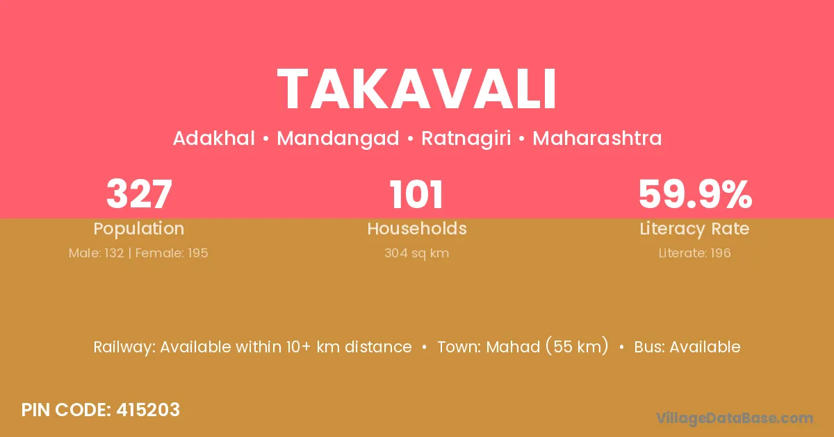 Mahad (55 km) is the nearest town to Takavali village for major economic activities and is located approximately 55 km away.