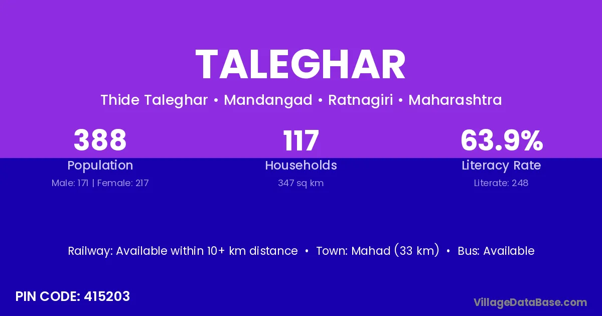 Mahad (33 km) is the nearest town to Taleghar village for major economic activities and is located approximately 33 km away.