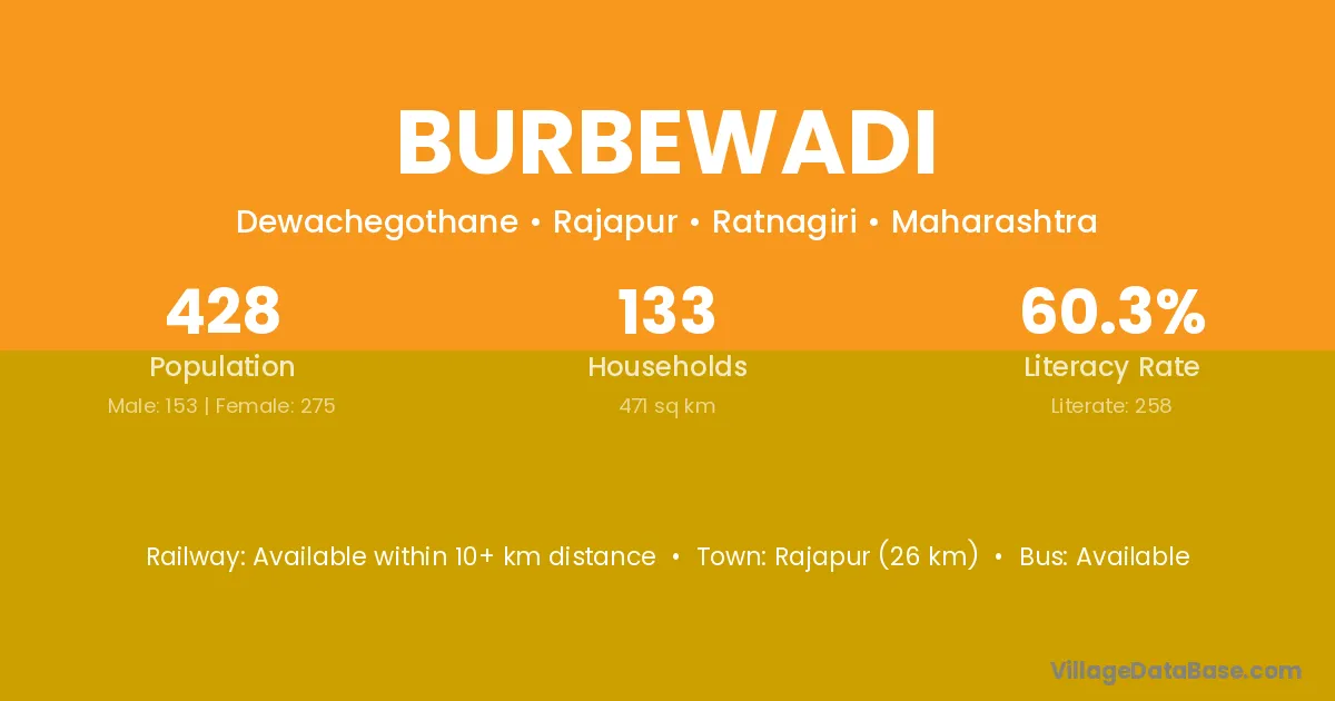 Burbewadi village has a total population of 428 people, of which 153 are males and 275 are females.