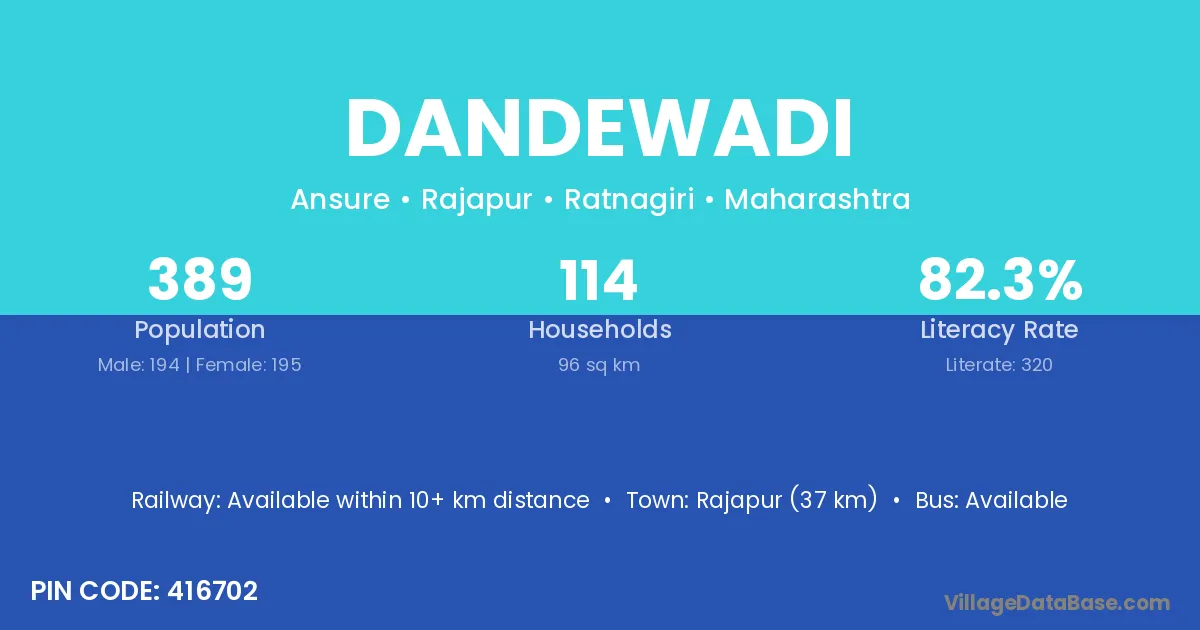 Rajapur (37 km) is the nearest town to Dandewadi village for major economic activities and is located approximately 37 km away.