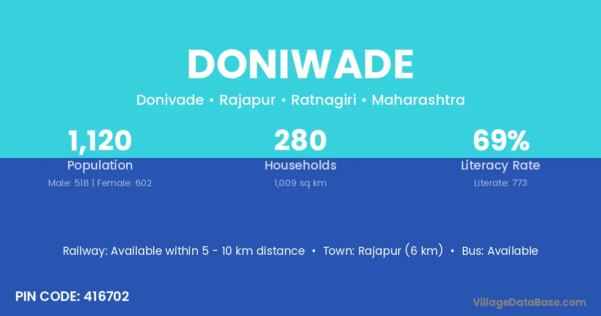 Rajapur (6 km) is the nearest town to Doniwade village for major economic activities and is located approximately 6 km away.