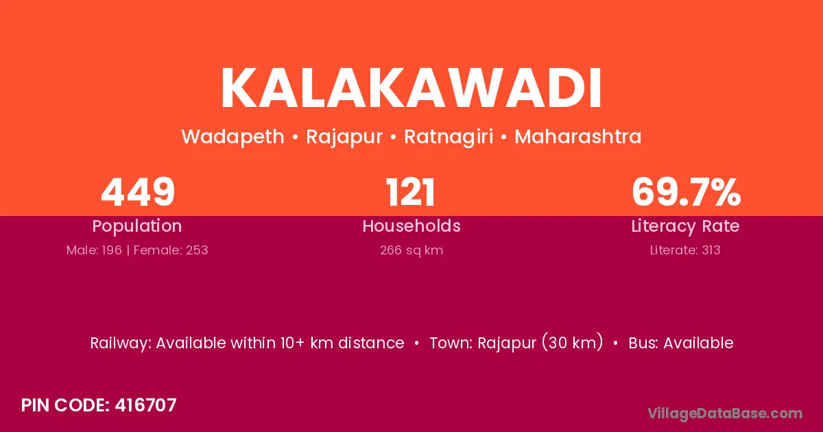 Rajapur (30 km) is the nearest town to Kalakawadi village for major economic activities and is located approximately 30 km away.