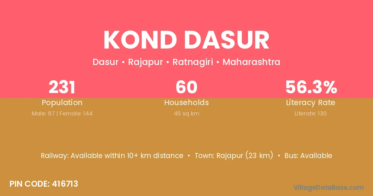 Rajapur (23 km) is the nearest town to Kond Dasur village for major economic activities and is located approximately 23 km away.