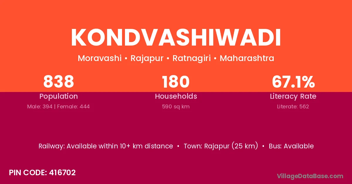 Kondvashiwadi village has a total population of 838 people, of which 394 are males and 444 are females.