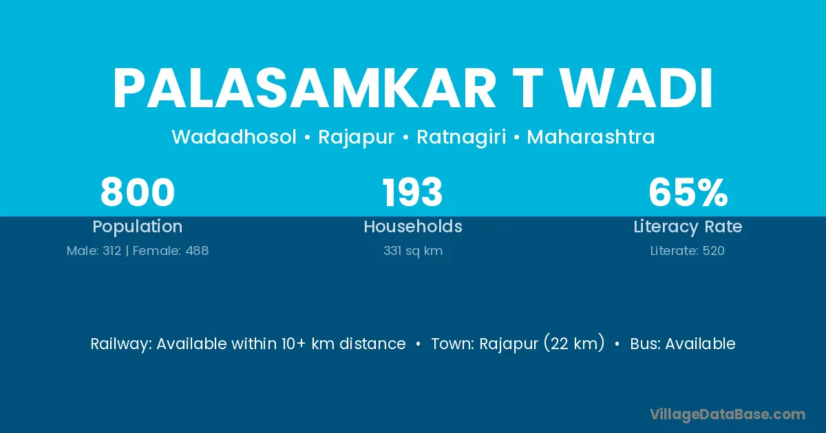 Rajapur (22 km) is the nearest town to Palasamkar T Wadi village for major economic activities and is located approximately 22 km away.