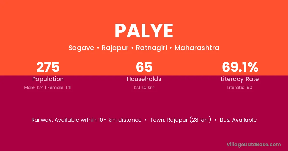 Rajapur (28 km) is the nearest town to Palye village for major economic activities and is located approximately 28 km away.