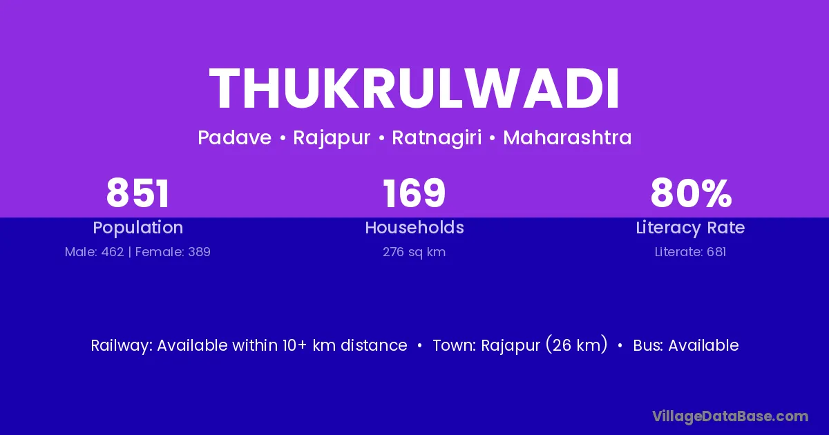 Rajapur (26 km) is the nearest town to Thukrulwadi village for major economic activities and is located approximately 26 km away.