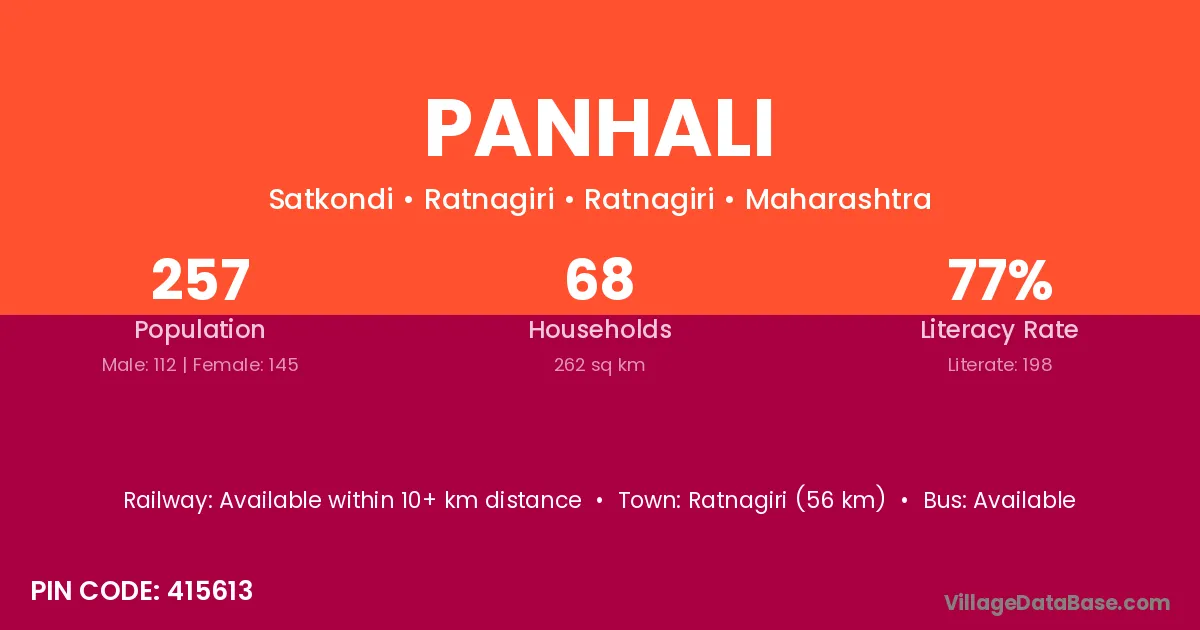 Ratnagiri (56 km) is the nearest town to Panhali village for major economic activities and is located approximately 56 km away.