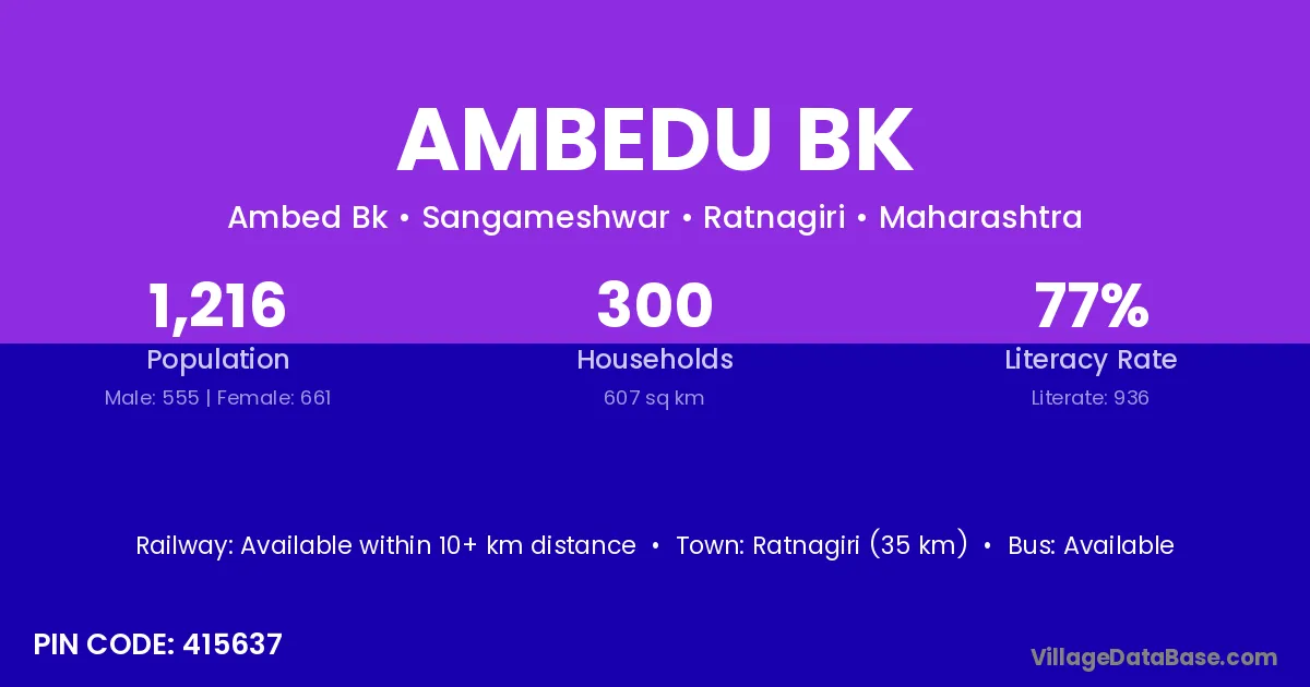 Ratnagiri (35 km) is the nearest town to Ambedu Bk village for major economic activities and is located approximately 35 km away.