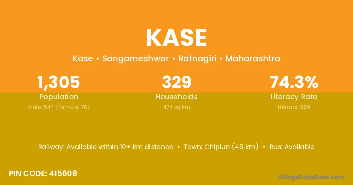 Chiplun (45 km) is the nearest town to Kase village for major economic activities and is located approximately 45 km away.