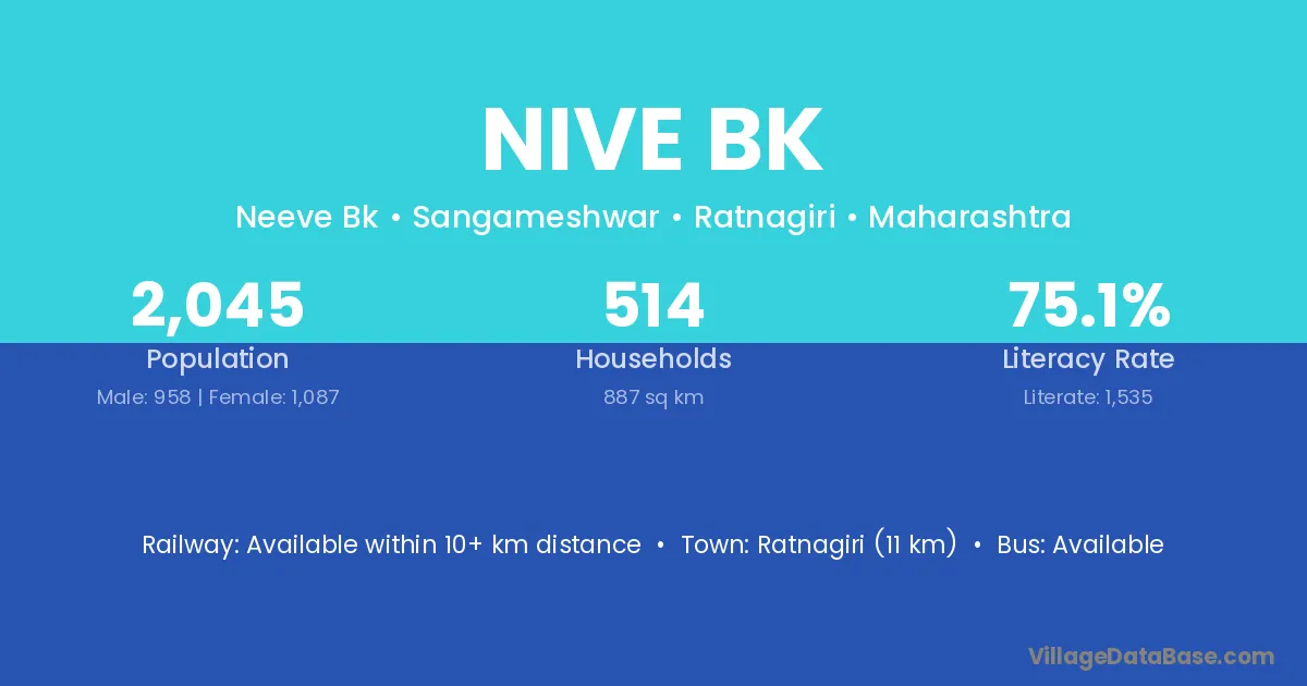 Ratnagiri (11 km) is the nearest town to Nive Bk village for major economic activities and is located approximately 11 km away.