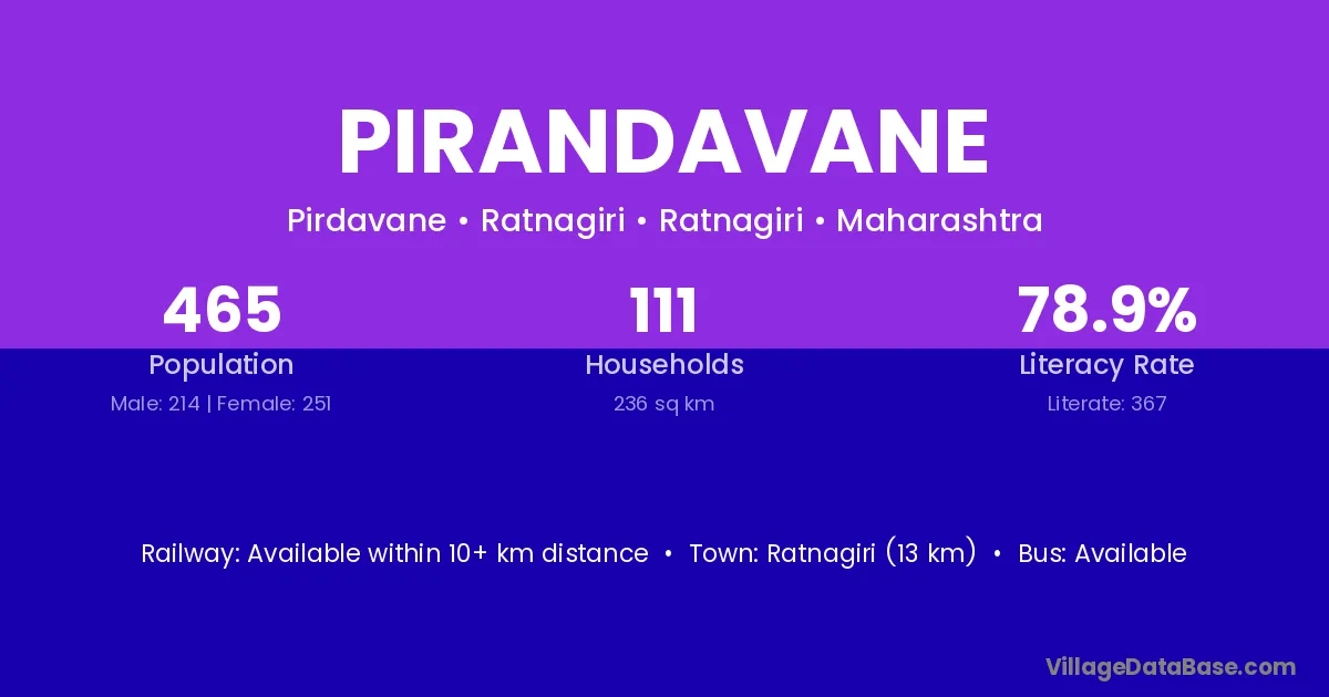 Ratnagiri (68 km) is the nearest town to Pirandavane village for major economic activities and is located approximately 68 km away.