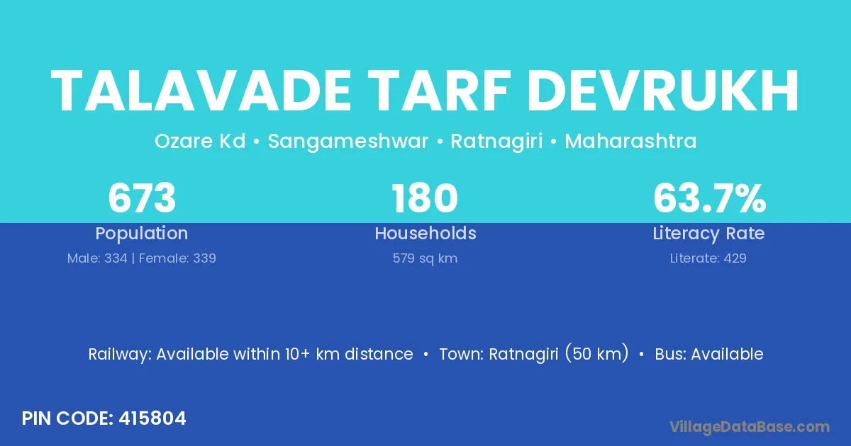 Talavade Tarf Devrukh village has a total population of 673 people, of which 334 are males and 339 are females.