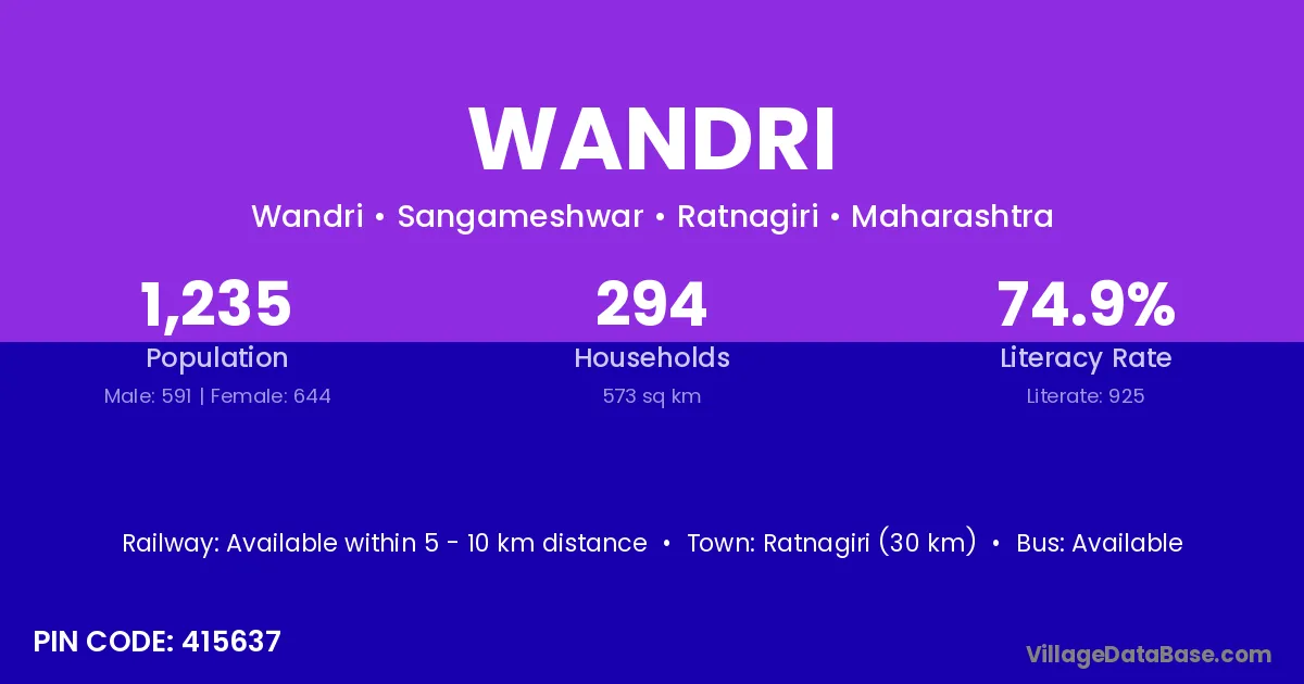 Ratnagiri (30 km) is the nearest town to Wandri village for major economic activities and is located approximately 30 km away.