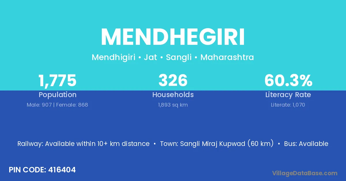 Sangli Miraj Kupwad (60 km) is the nearest town to Mendhegiri village for major economic activities and is located approximately 60 km away.