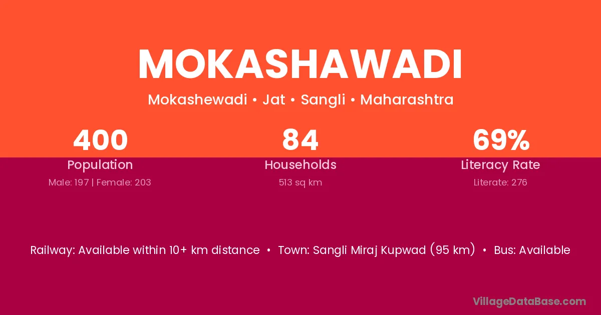 Sangli Miraj Kupwad (95 km) is the nearest town to Mokashawadi village for major economic activities and is located approximately 95 km away.