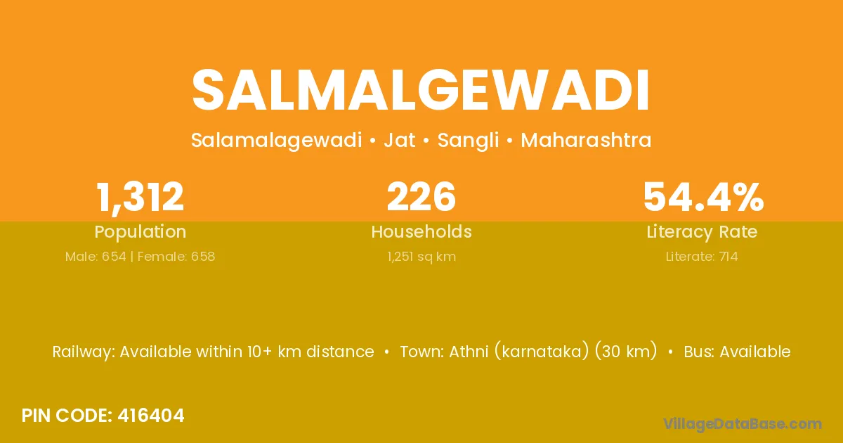 Athni (karnataka) (30 km) is the nearest town to Salmalgewadi village for major economic activities and is located approximately 30 km away.