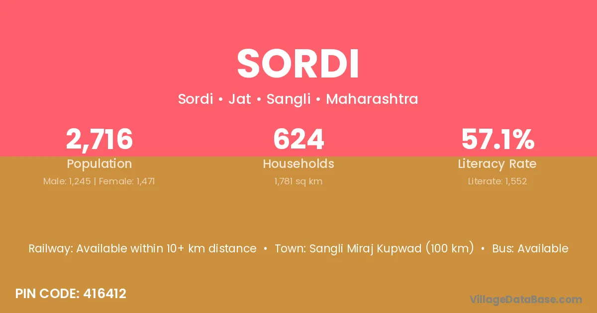 Sangli Miraj Kupwad (100 km) is the nearest town to Sordi village for major economic activities and is located approximately 100 km away.