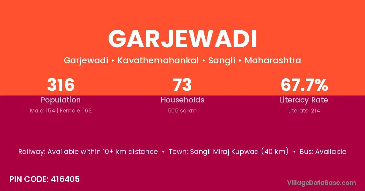Sangli Miraj Kupwad (40 km) is the nearest town to Garjewadi village for major economic activities and is located approximately 40 km away.