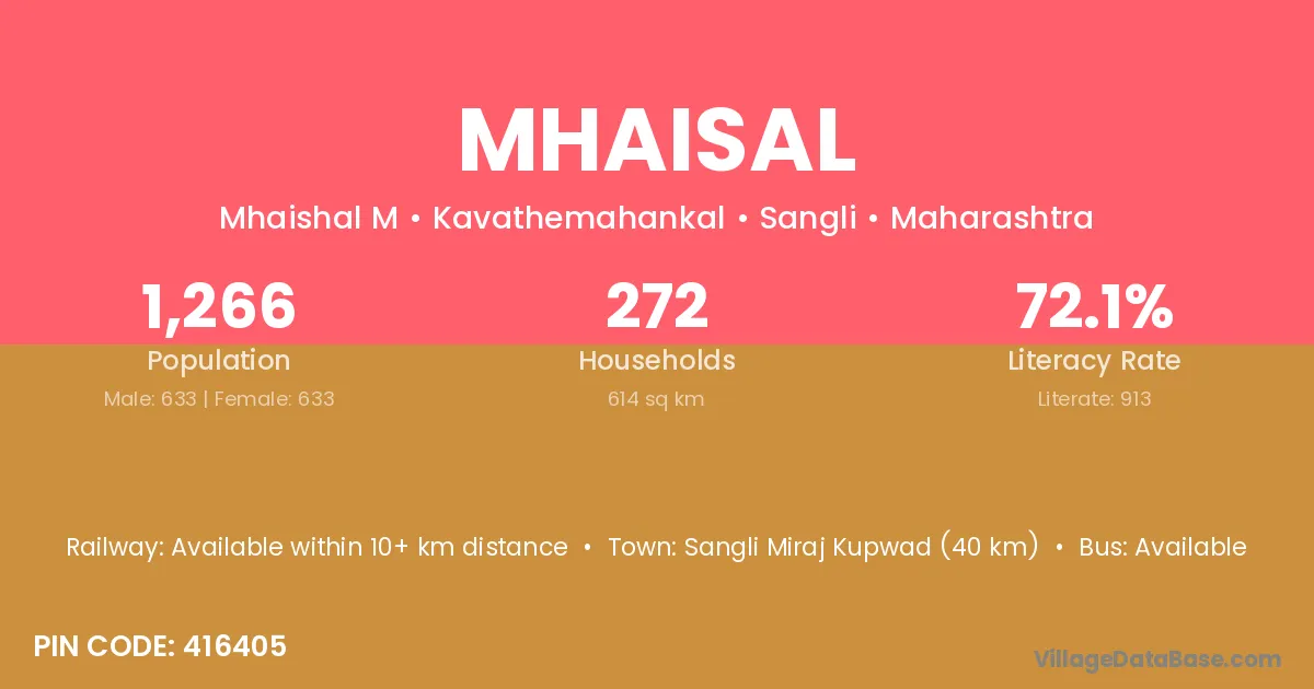 Mhaisal village has a total population of 1,266 people, of which 633 are males and 633 are females.