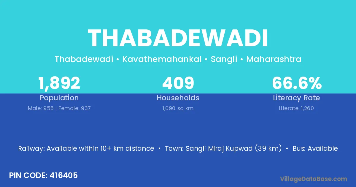 Sangli Miraj Kupwad (39 km) is the nearest town to Thabadewadi village for major economic activities and is located approximately 39 km away.