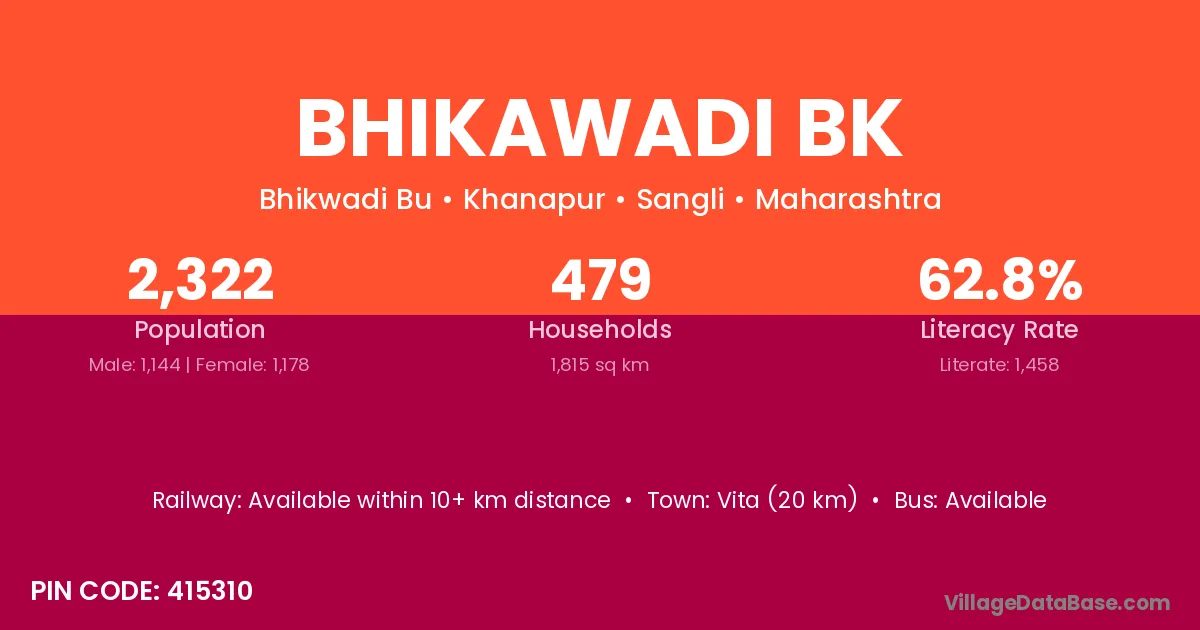Vita (20 km) is the nearest town to Bhikawadi Bk village for major economic activities and is located approximately 20 km away.