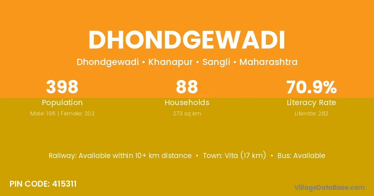 Vita (17 km) is the nearest town to Dhondgewadi village for major economic activities and is located approximately 17 km away.