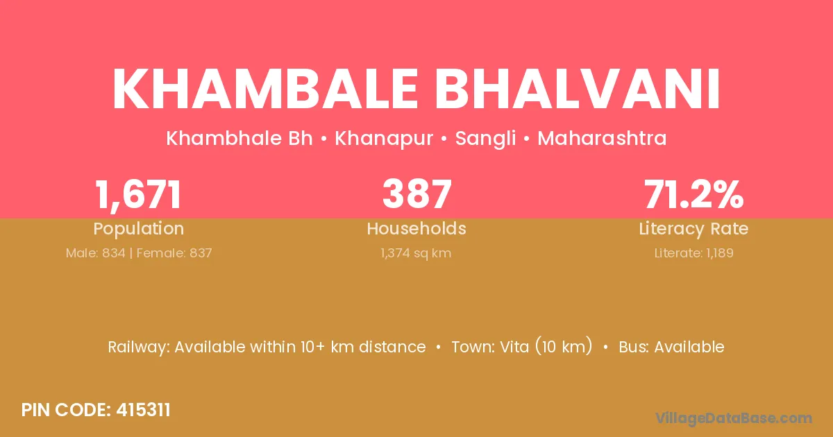 Khambale Bhalvani village has a total population of 1,671 people, of which 834 are males and 837 are females.