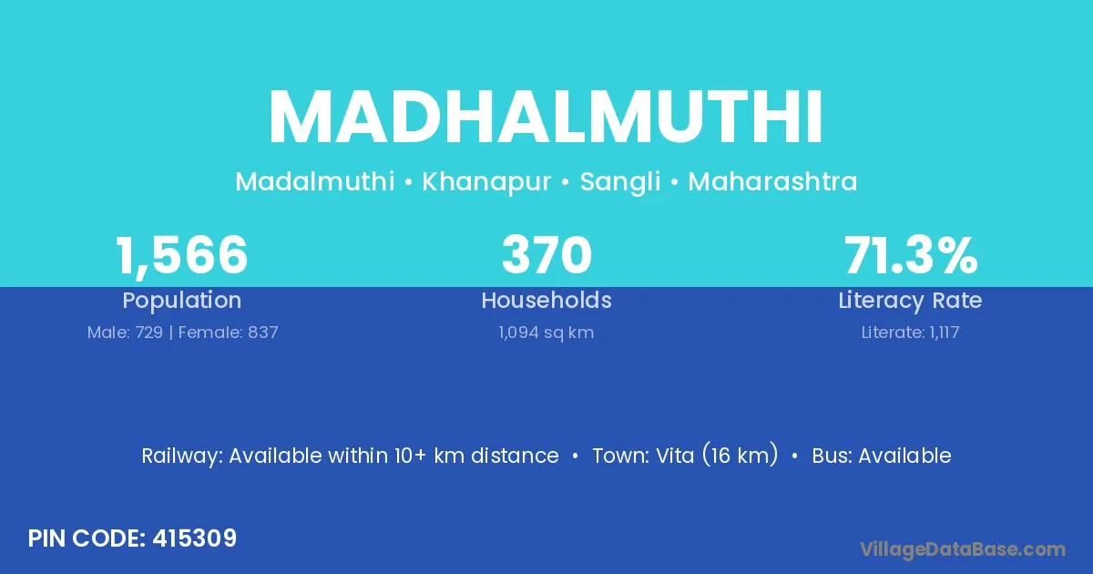 Vita (16 km) is the nearest town to Madhalmuthi village for major economic activities and is located approximately 16 km away.