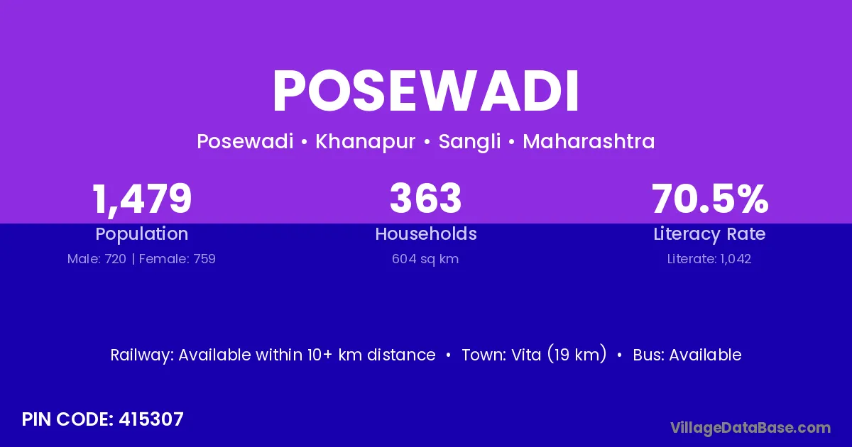 Posewadi village has a total population of 1,479 people, of which 720 are males and 759 are females.