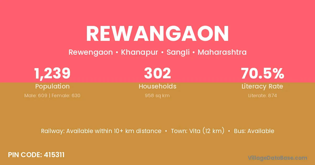 Vita (12 km) is the nearest town to Rewangaon village for major economic activities and is located approximately 12 km away.