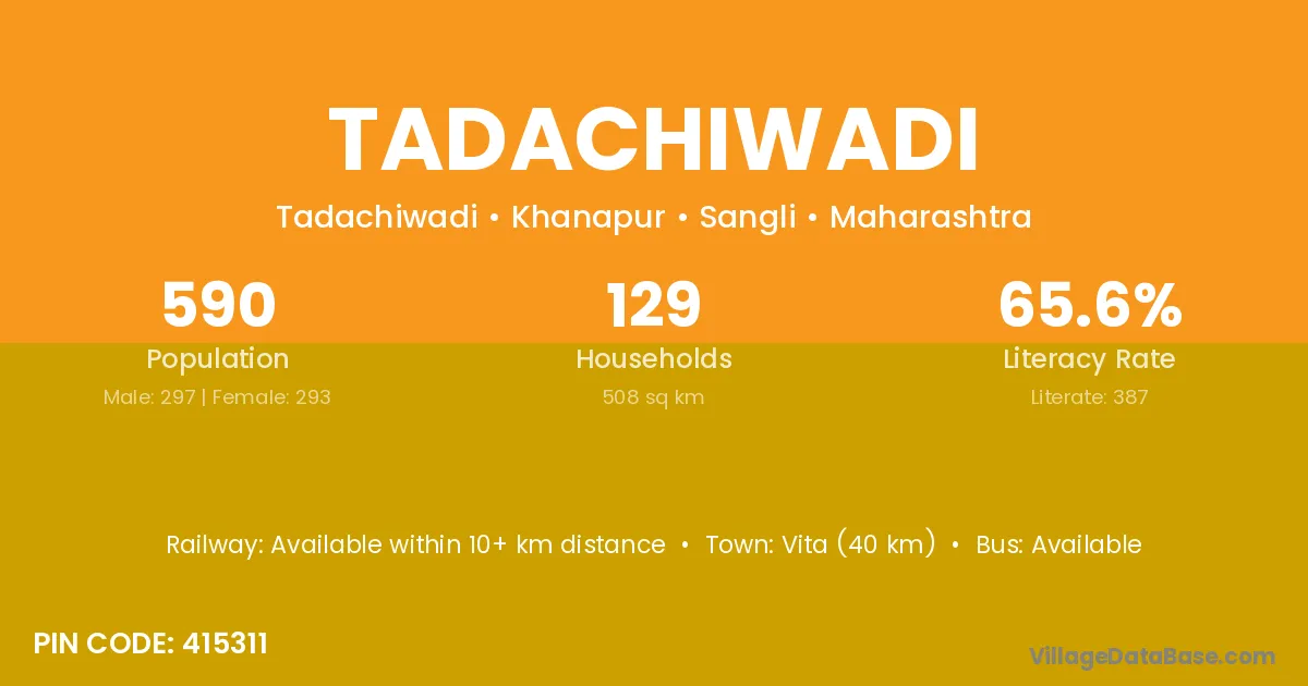 Vita (40 km) is the nearest town to Tadachiwadi village for major economic activities and is located approximately 40 km away.
