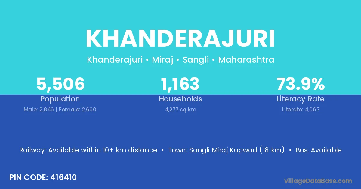 Sangli Miraj Kupwad (18 km) is the nearest town to Khanderajuri village for major economic activities and is located approximately 18 km away.