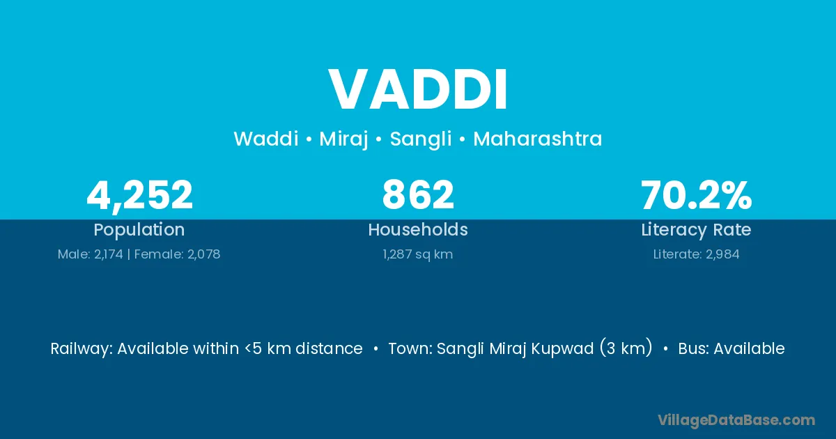 Sangli Miraj Kupwad (3 km) is the nearest town to Vaddi village for major economic activities and is located approximately 3 km away.