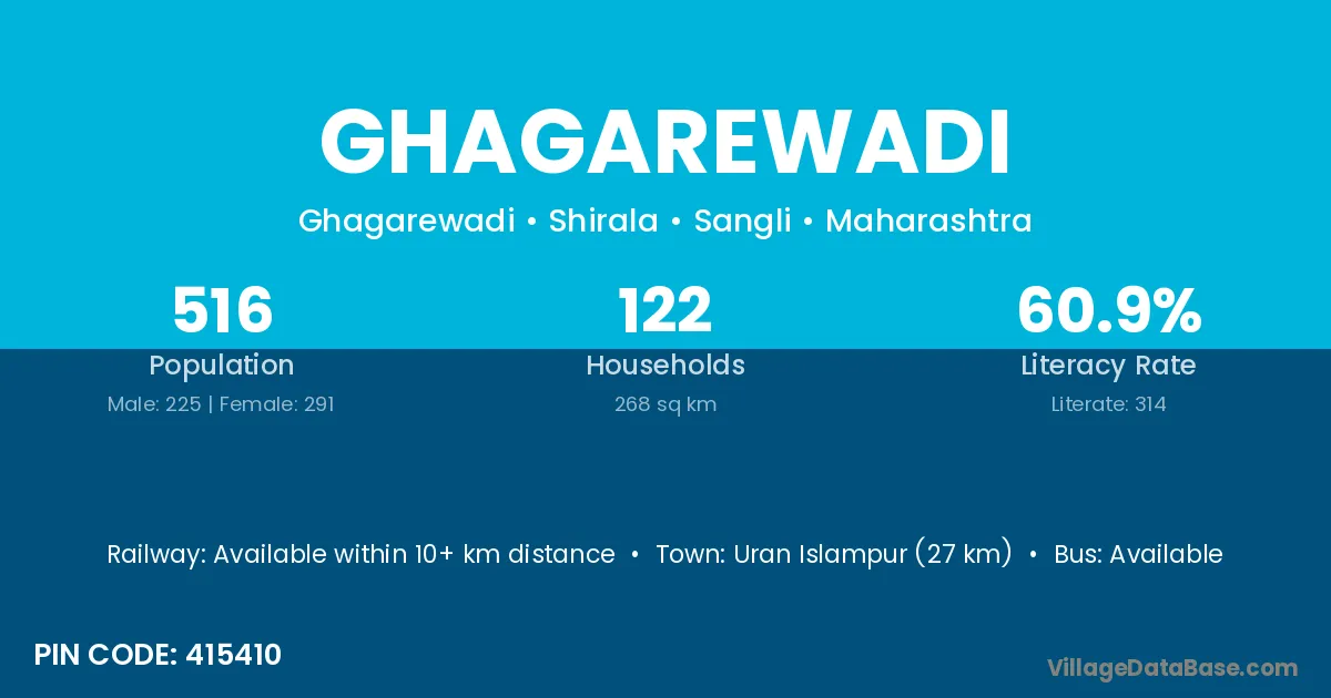Ghagarewadi village has a total population of 516 people, of which 225 are males and 291 are females.