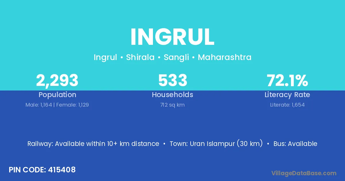 Ingrul village has a total population of 2,293 people, of which 1,164 are males and 1,129 are females.