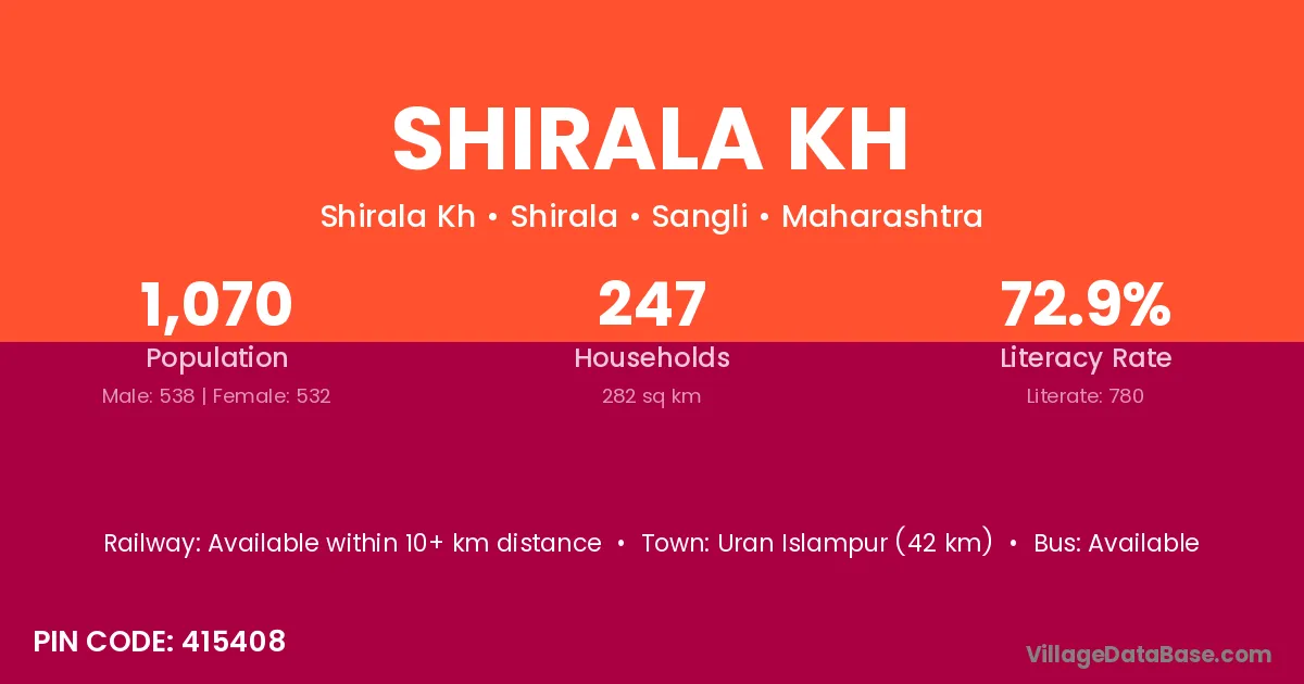 Shirala Kh village has a total population of 1,070 people, of which 538 are males and 532 are females.