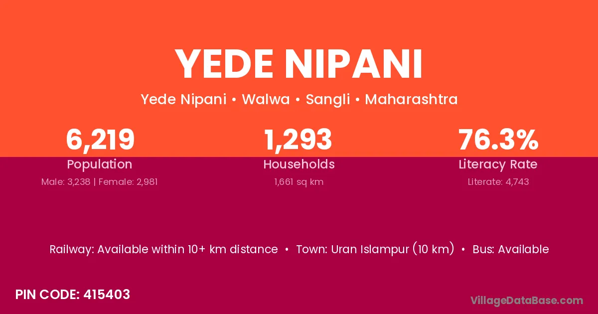 Uran Islampur (10 km) is the nearest town to Yede Nipani village for major economic activities and is located approximately 10 km away.