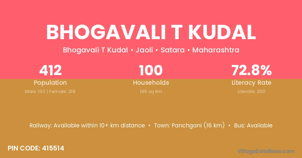 Bhogavali T Kudal village has a total population of 412 people, of which 193 are males and 219 are females.