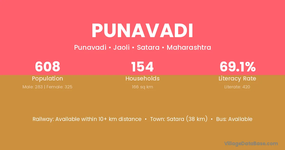 Punavadi village has a total population of 608 people, of which 283 are males and 325 are females.