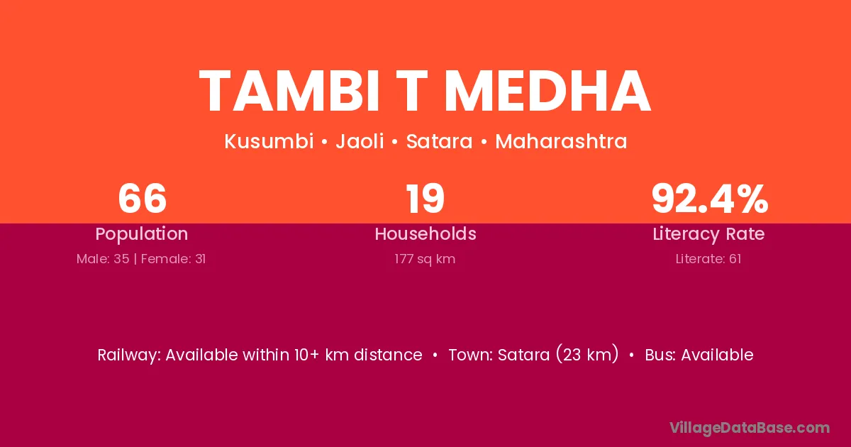 Satara (23 km) is the nearest town to Tambi T Medha village for major economic activities and is located approximately 23 km away.