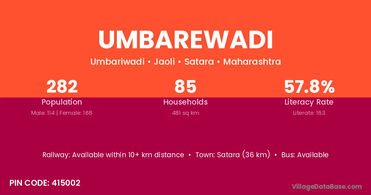 Satara (36 km) is the nearest town to Umbarewadi village for major economic activities and is located approximately 36 km away.