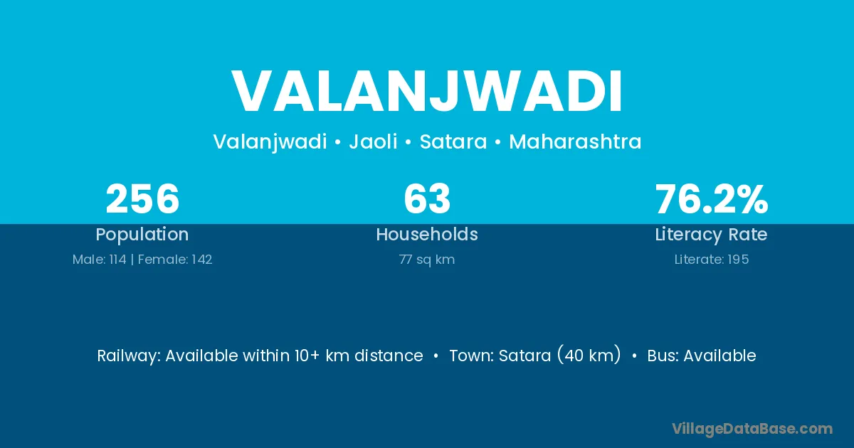 Satara (40 km) is the nearest town to Valanjwadi village for major economic activities and is located approximately 40 km away.