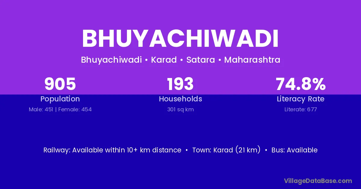 Karad (21 km) is the nearest town to Bhuyachiwadi village for major economic activities and is located approximately 21 km away.