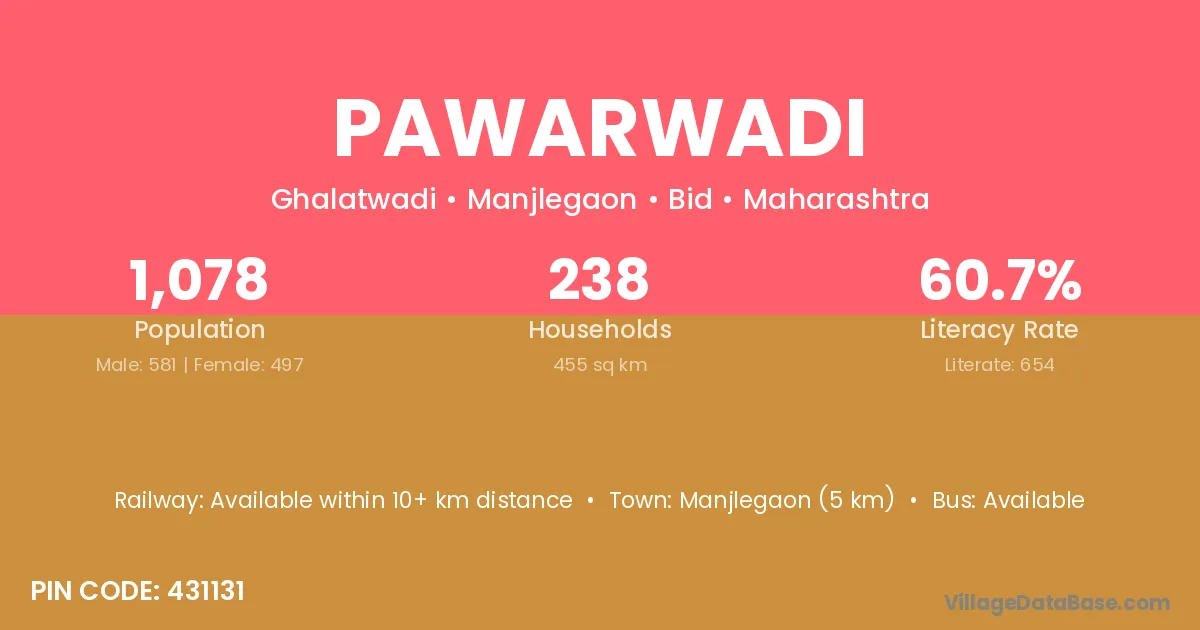 The literacy rate of Pawarwadi village is 66.79%. Male literacy stands at 79.39% and female literacy at 55.00%.