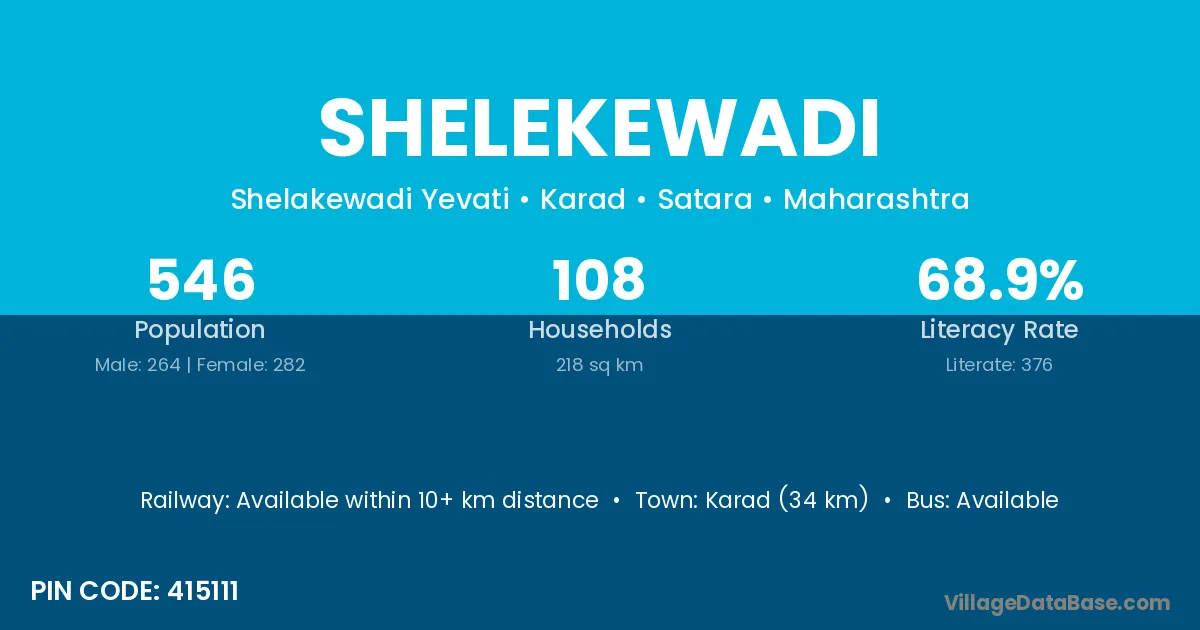 Karad (34 km) is the nearest town to Shelekewadi village for major economic activities and is located approximately 34 km away.
