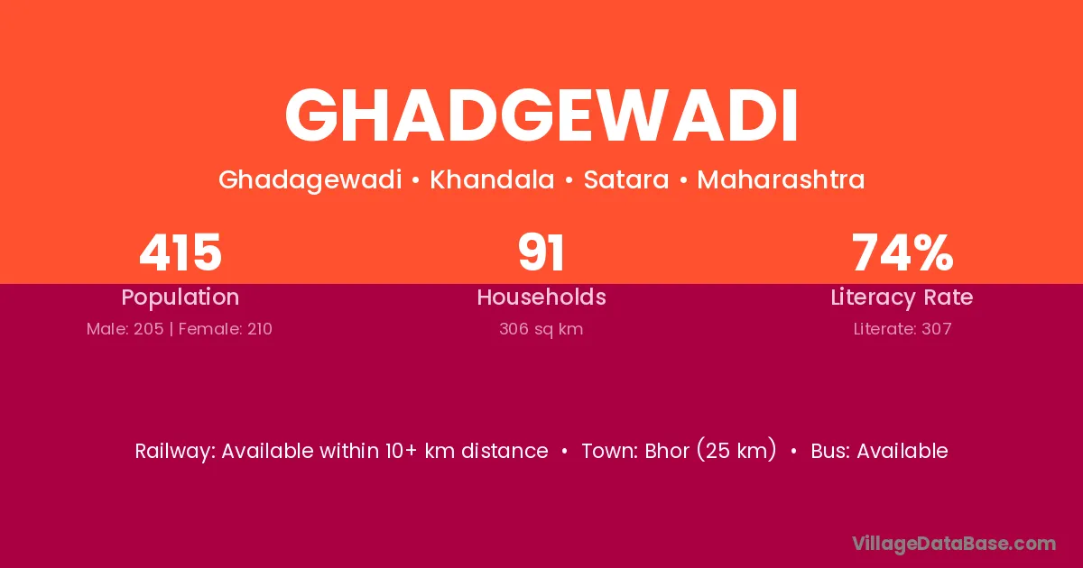 Ghadgewadi village has a total population of 415 people, of which 205 are males and 210 are females.