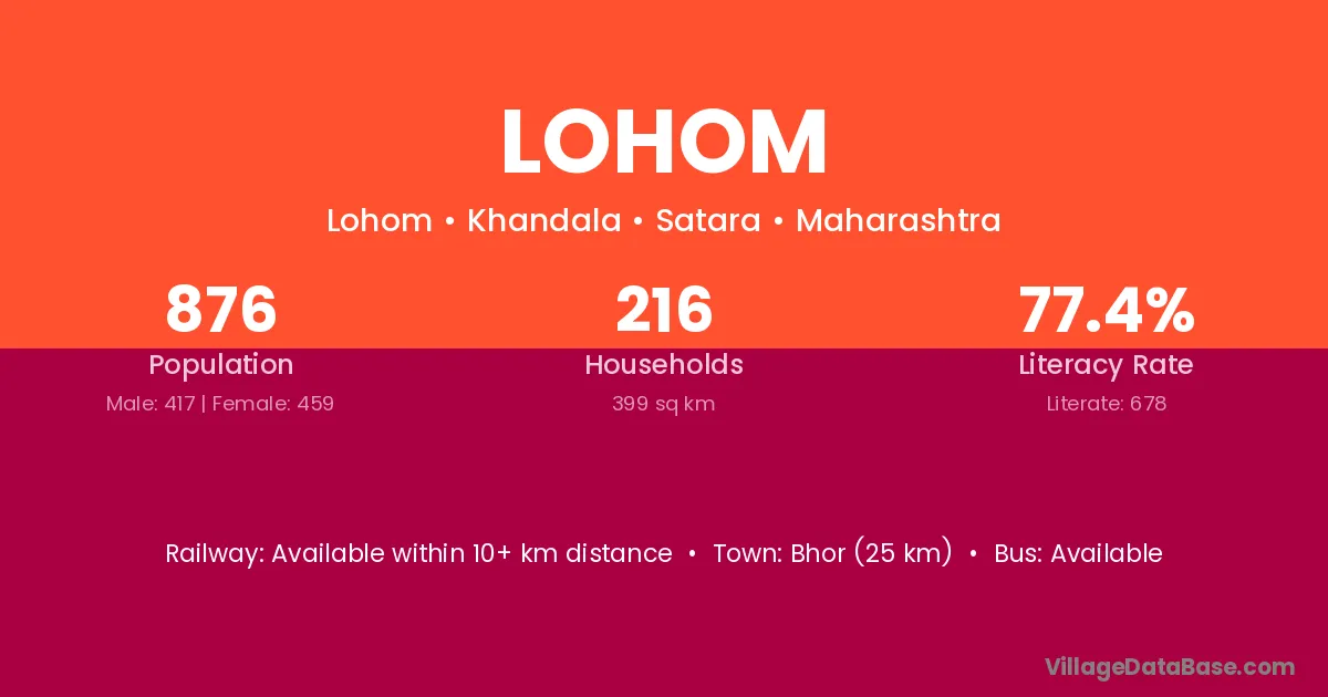 Bhor (25 km) is the nearest town to Lohom village for major economic activities and is located approximately 25 km away.