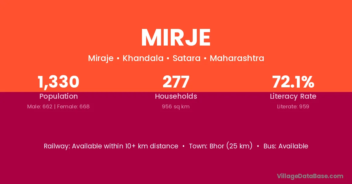 Bhor (25 km) is the nearest town to Mirje village for major economic activities and is located approximately 25 km away.