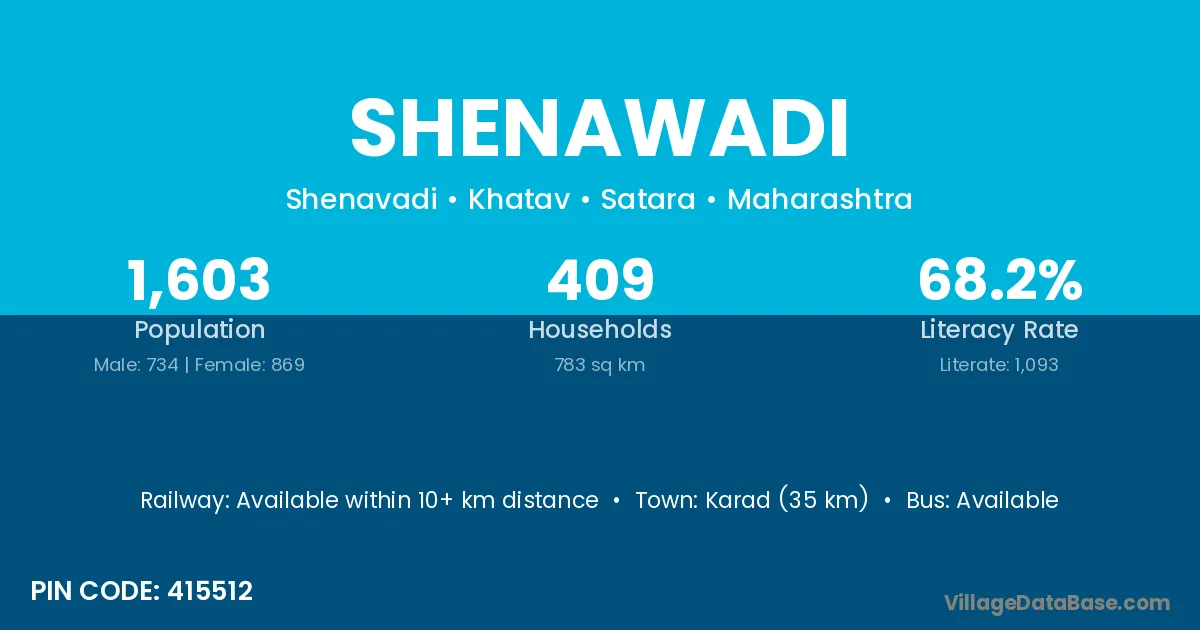 Shenawadi village has a total population of 1,603 people, of which 734 are males and 869 are females.